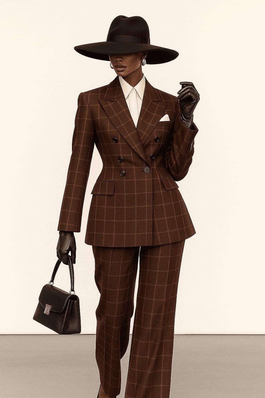 Brown checkered double-breasted suit with matching trousers, white shirt, wide black hat, leather gloves, and a black handbag – sharp, elegant, and powerful.