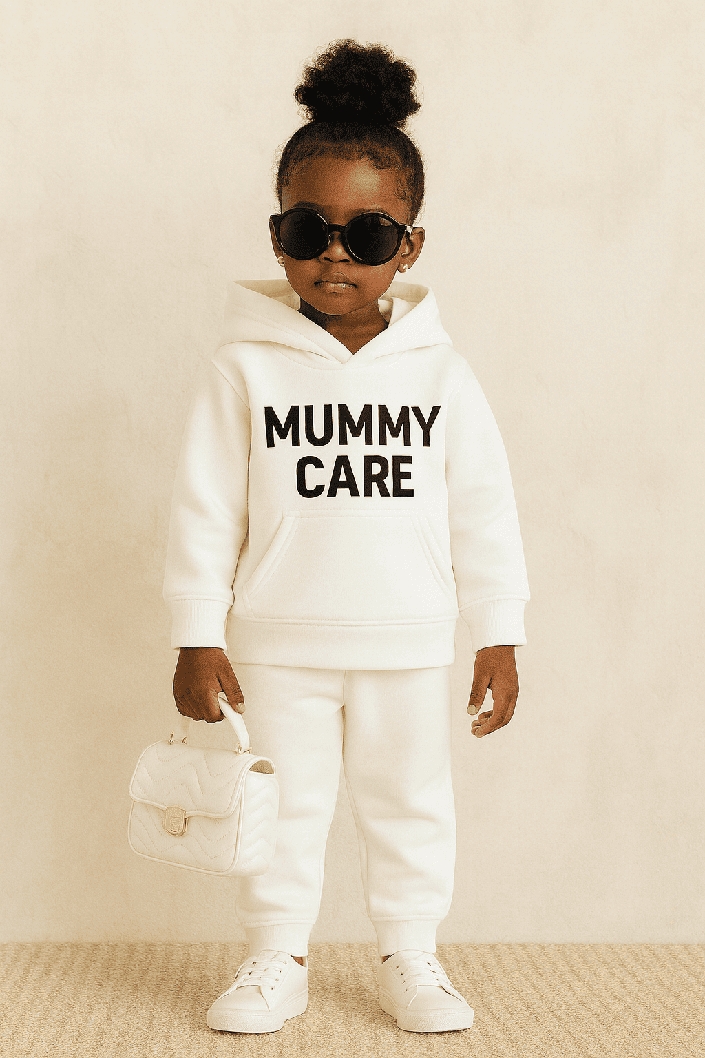 A cozy white children’s hoodie and jogger setfeaturing bold .